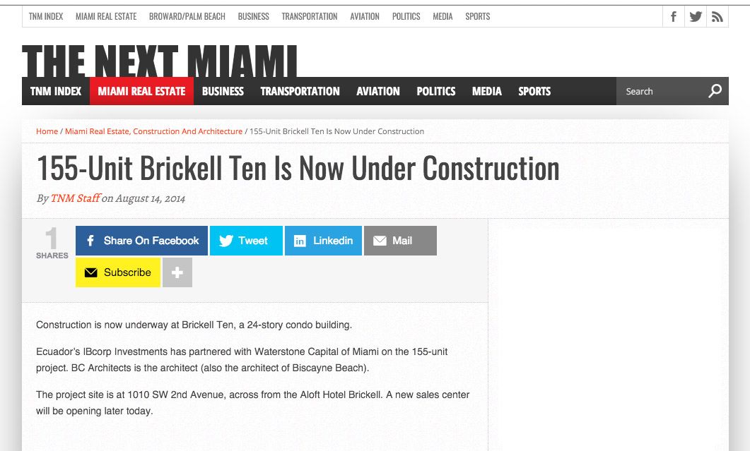 Ecuador’s IBcorp Investments has partnered with Waterstone Capital of Miami on the 155-unit project. BC Architects is the architect (also the architect of Biscayne Beach).