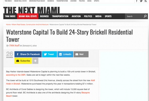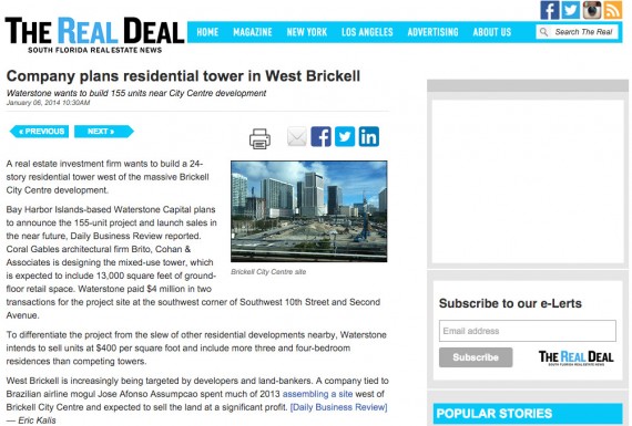 Magazine: The real deal A real estate investment firm wants to build a 24-story residential tower west of the massive Brickell City Centre development. Bay Harbor Islands-based Waterstone Capital plans to announce the 155-unit project and launch sales in the near future, Daily Business Review […]