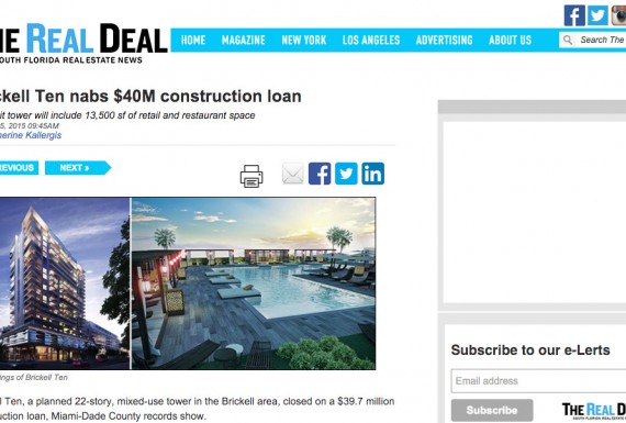 Magazine: The real deal Brickell Ten, a planned 22-story, mixed-use tower in the Brickell area, closed on a $39.7 million construction loan, Miami-Dade County records show. The 155-unit condominium, which will include 13,500 square feet of retail and restaurant space on the ground and mezzanine […]