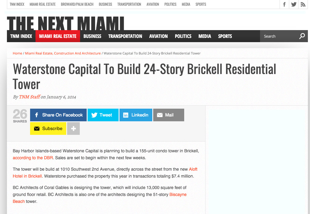 Bay Harbor Islands-based Waterstone Capital is planning to build a 155-unit condo tower in Brickell,according to the DBR. Sales are set to begin within the next few weeks.