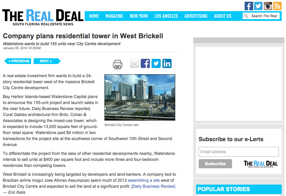 A real estate investment firm wants to build a 24-story residential tower west of the massive Brickell City Centre development. Bay Harbor Islands-based Waterstone Capital plans to announce the 155-unit project and launch sales in the near future, Daily Business Review reported. Coral Gables architectural firm Brito, Cohan & Associates is designing the mixed-use tower, which is expected to include 13,000 square feet of ground-floor retail space. Waterstone paid $4 million in two transactions for the project site at the southwest corner of Southwest 10th Street and Second Avenue. To differentiate the project from the slew of other residential developments nearby, Waterstone intends to sell units at $400 per square foot and include more three and four-bedroom residences than competing towers. West Brickell is increasingly being targeted by developers and land-bankers. A company tied to Brazilian airline mogul Jose Afonso Assumpcao spent much of 2013 assembling a site west of Brickell City Centre and expected to sell the land at a significant profit. [Daily Business Review] — Eric Kalis.